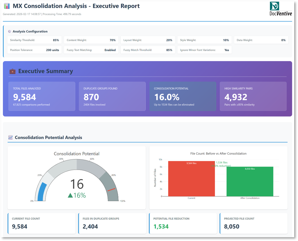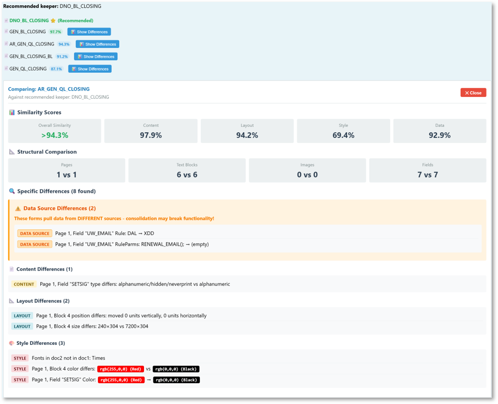 - Summary & Detailed Reporting: summary and detailed reporting capabilities, including difference viewer to compare various files and color-coded confidence scoring of each group file relative to a “keeper” file, and CSV export of similarity, consolidation and duplication scoring data.